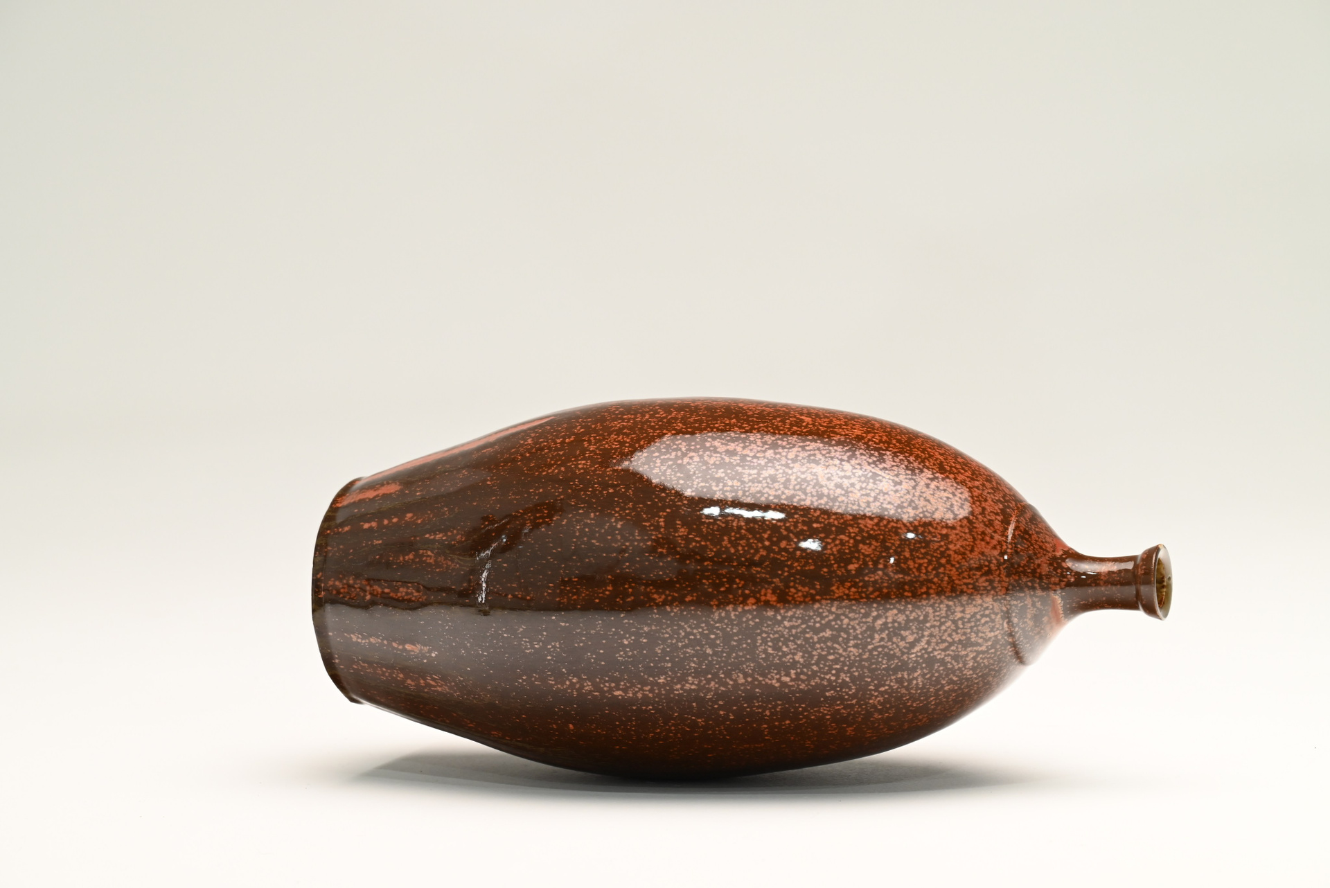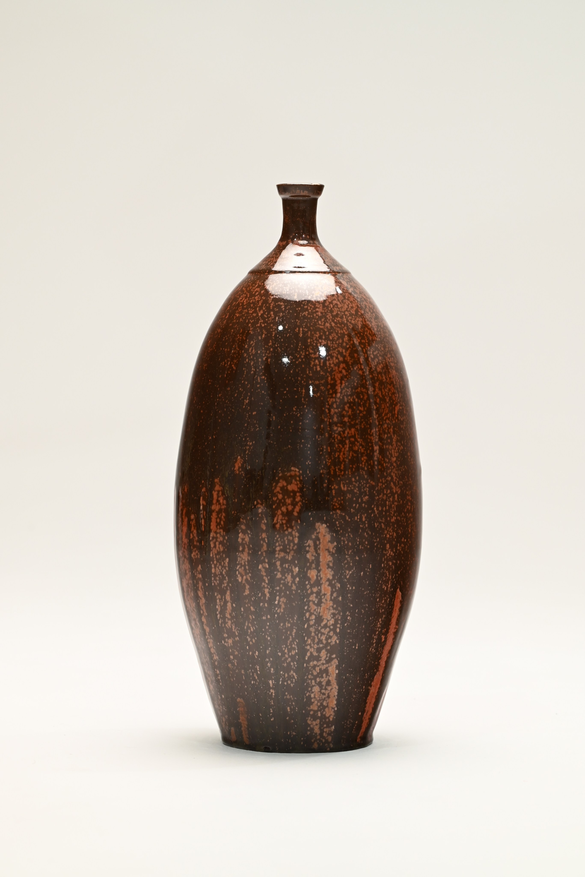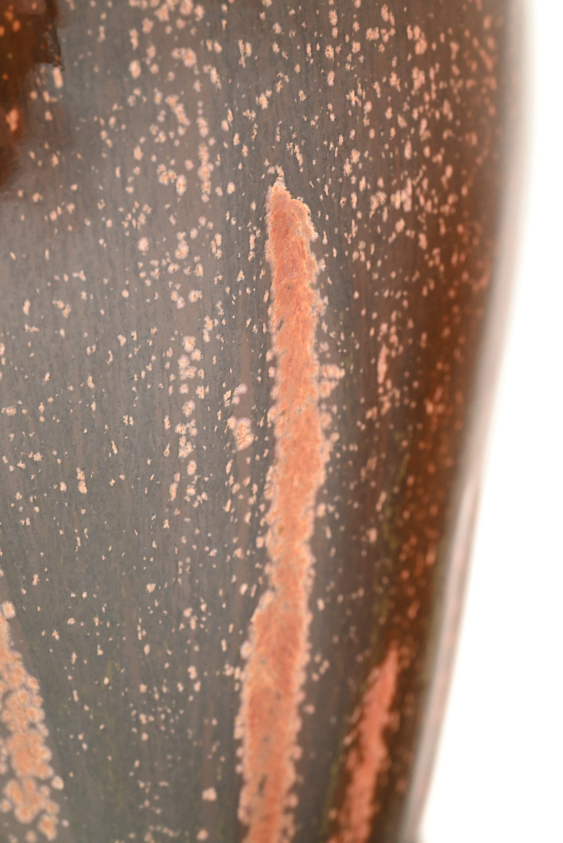 Каменная масса, глазурь. 44х19 см. Петрикор - землистый запах, который ощущается сразу после начала дождя. Коричневый цвет глазури напоминает землю, впервые напитанную влагой после засухи. Поверхность гладкая и обтекаемая, как если бы вещество само стремилось принять форму движения воды. В этом сосуде соединяются запах дождя, влажная теплая почва и мгновение, когда сухая материя вновь становится живой.