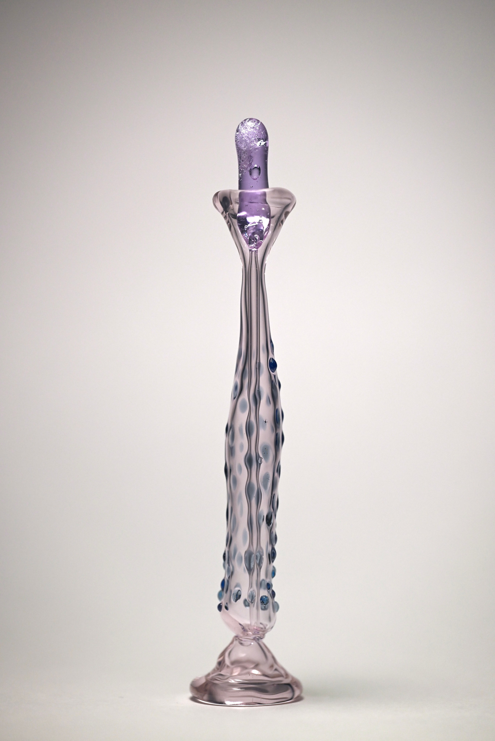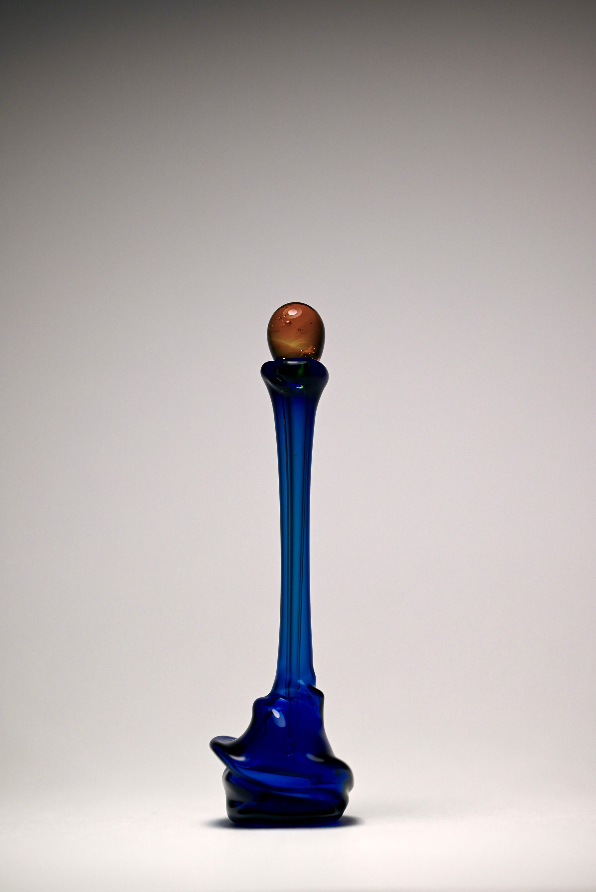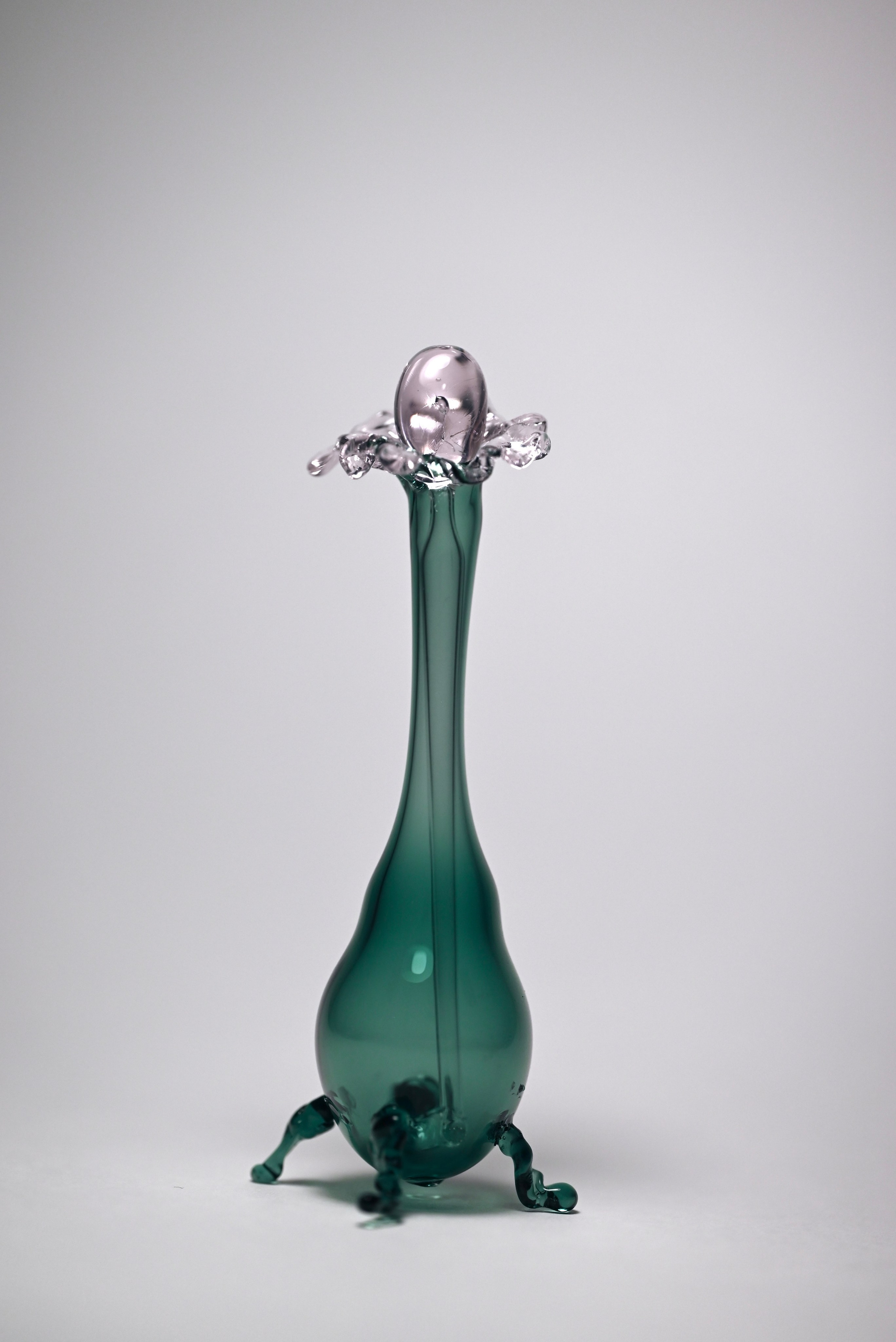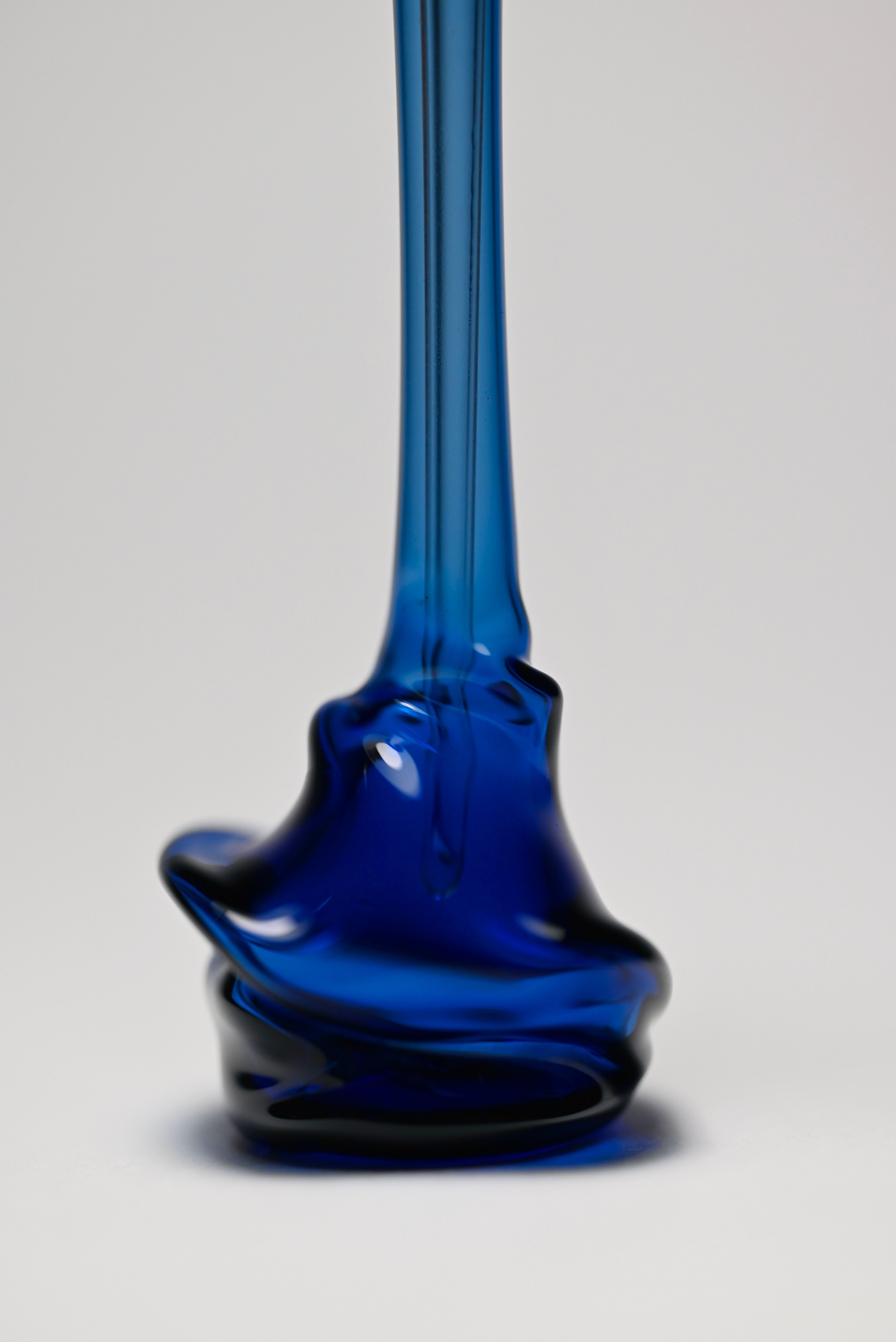 Флакон «Лень». Боросиликатное стекло. 2025 г.Флакон «Лень» - это форма, уставшая быть формой. Он отказался от усилия, позволил себе стекать, тянуться. Он не хочет быть «правильным» сосудом, не держит спину прямо и не стремится к симметрии. Он — как тело в утренней постели, как мысль, не вставшая с дивана. В «Лени» — смелость покоя. Она про внутреннее разрешение: быть неэффективным, быть собой.Стекло, податливое огню, здесь стало телом, выбравшим отдых вместо действия.