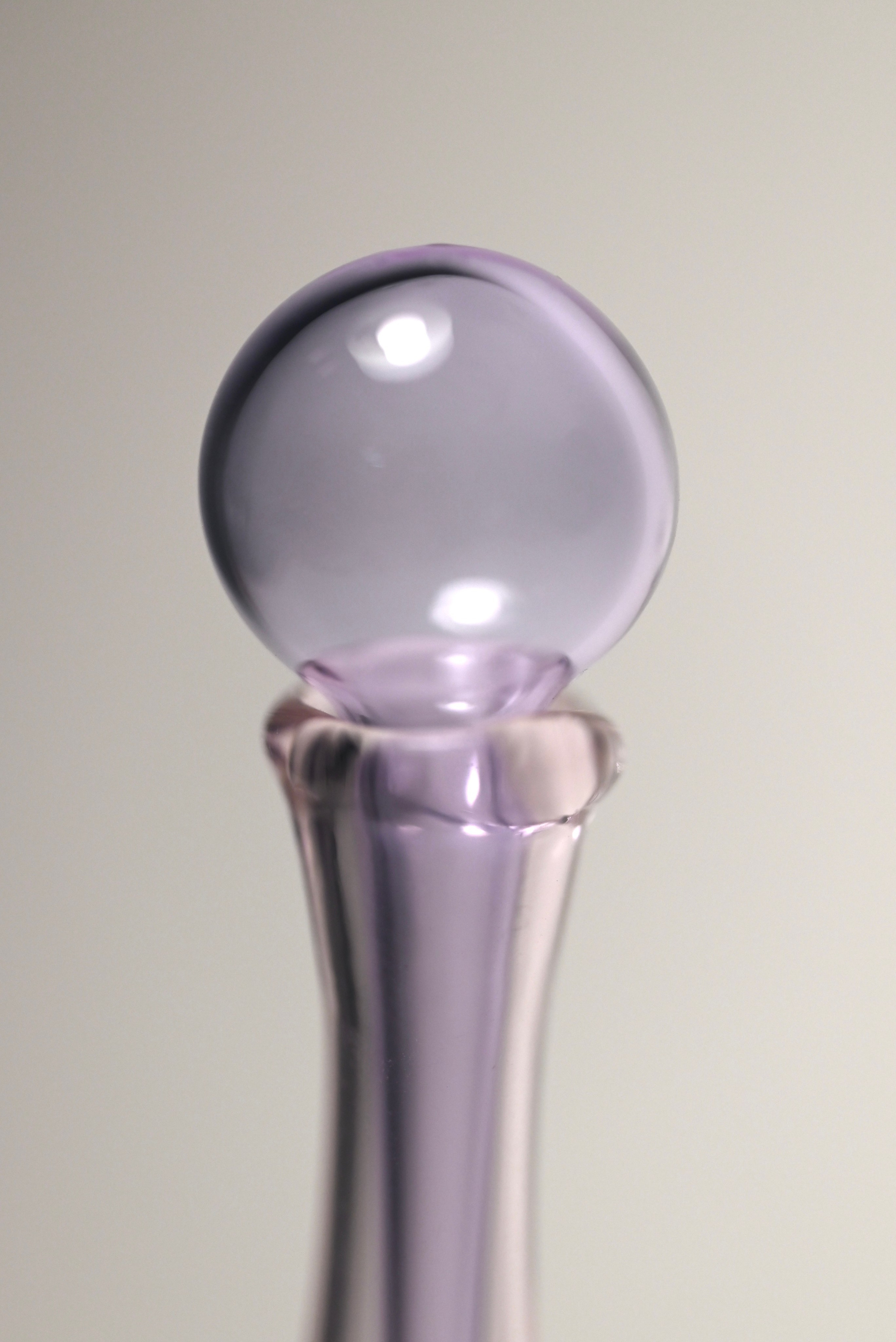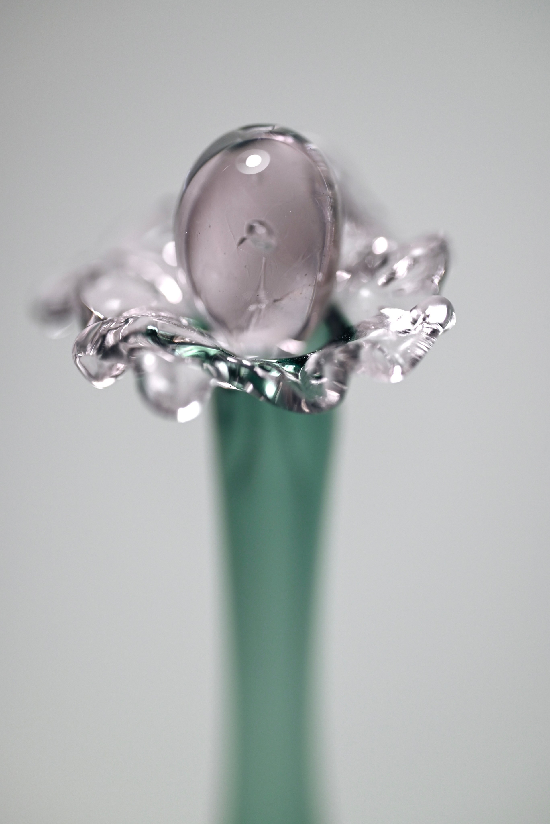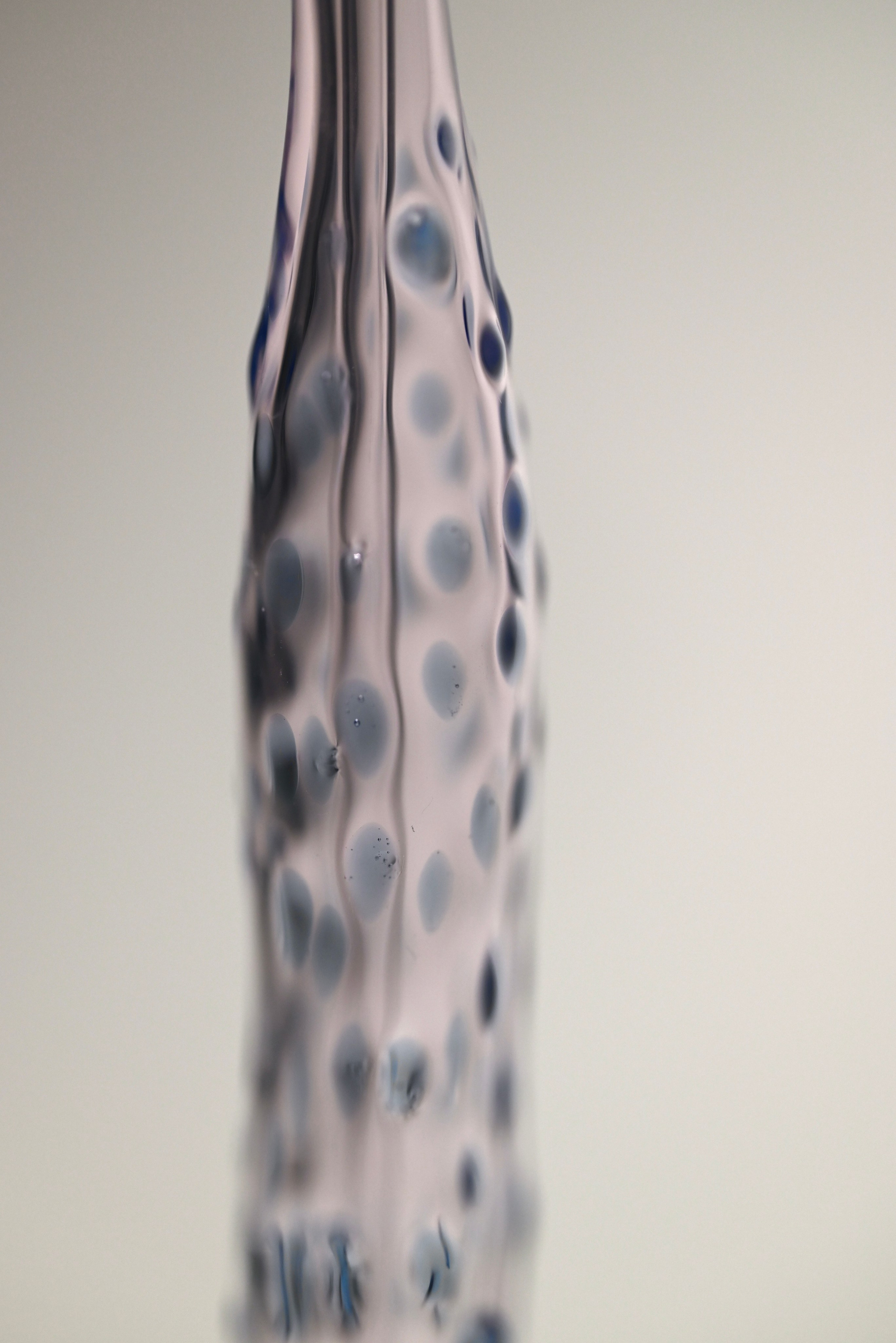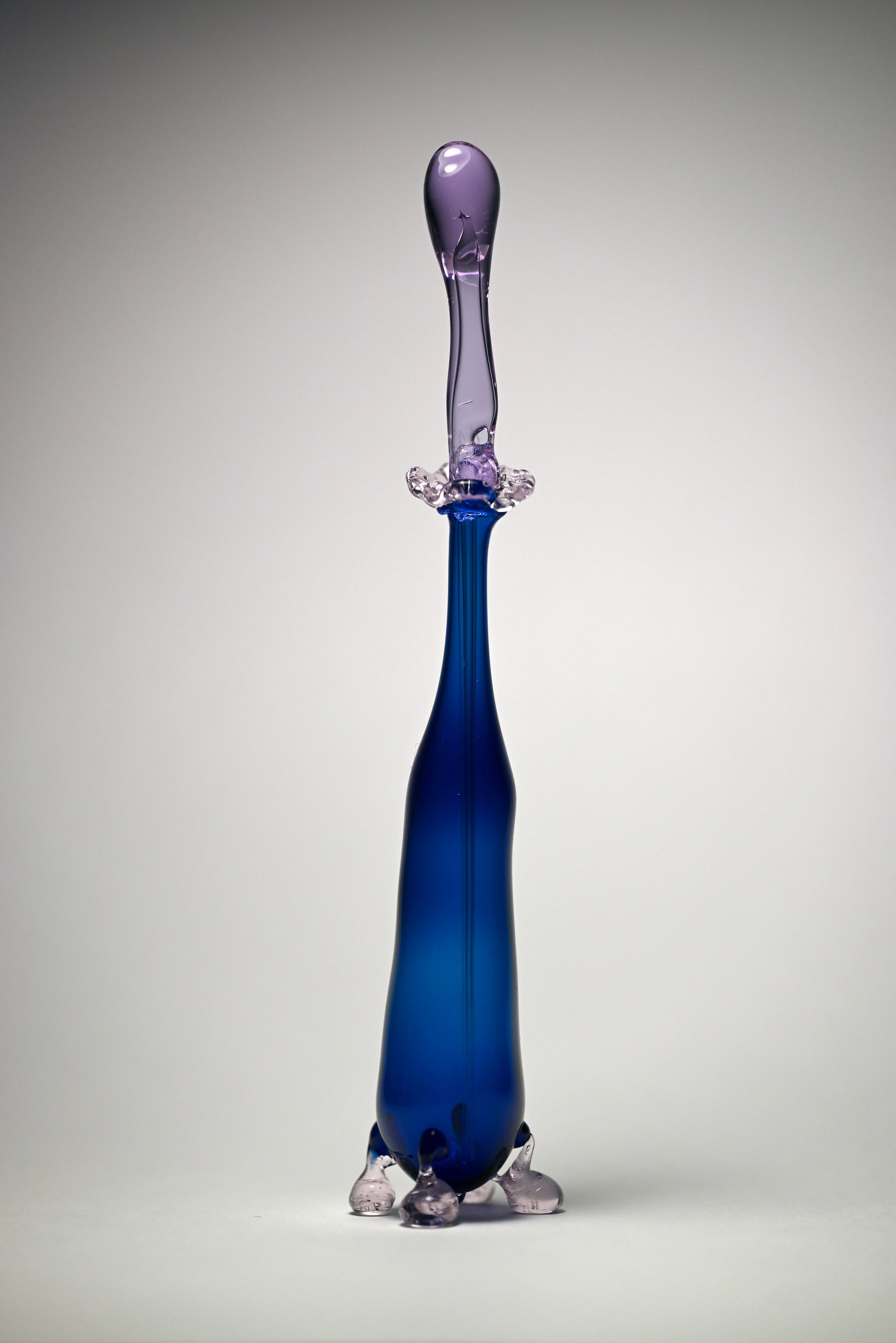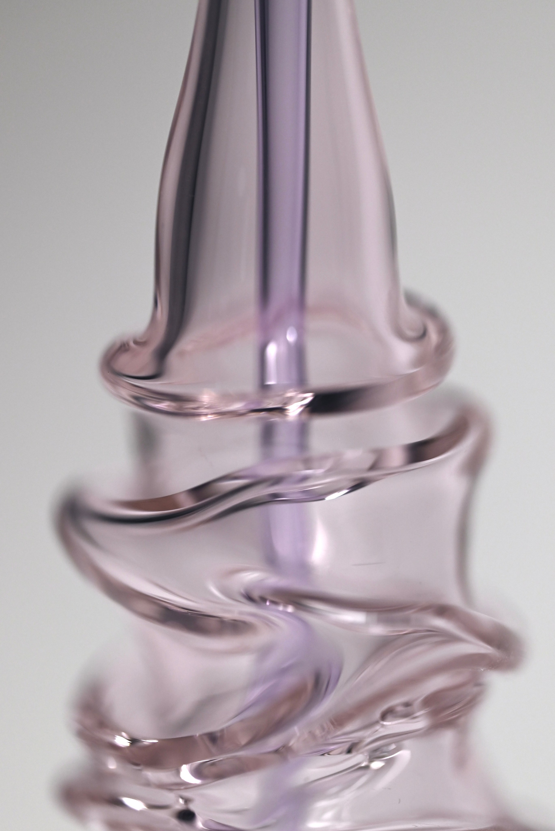 Флакон «Лень». Боросиликатное стекло. 2025 г.Флакон «Лень» - это форма, уставшая быть формой. Он отказался от усилия, позволил себе стекать, тянуться. Он не хочет быть «правильным» сосудом, не держит спину прямо и не стремится к симметрии. Он — как тело в утренней постели, как мысль, не вставшая с дивана. В «Лени» — смелость покоя. Она про внутреннее разрешение: быть неэффективным, быть собой.Стекло, податливое огню, здесь стало телом, выбравшим отдых вместо действия.