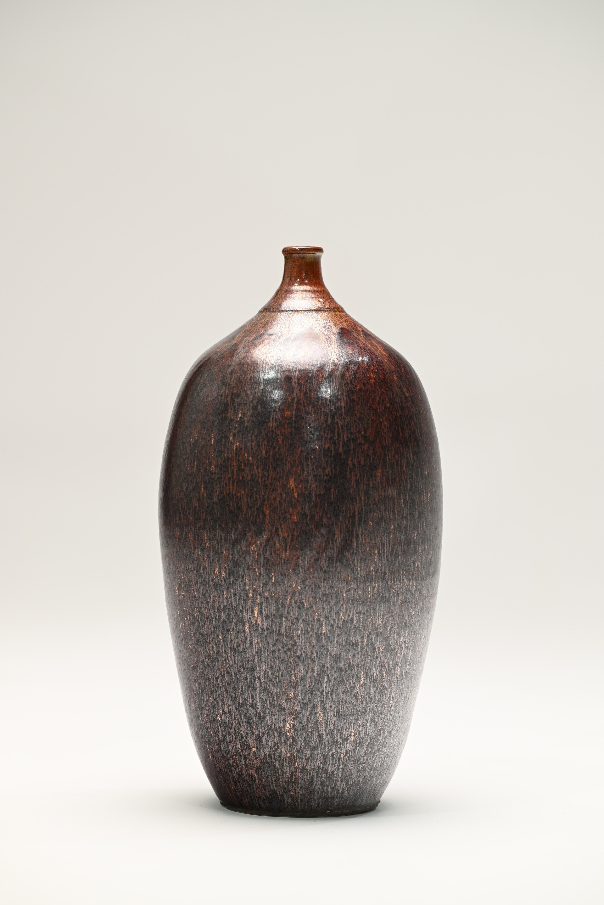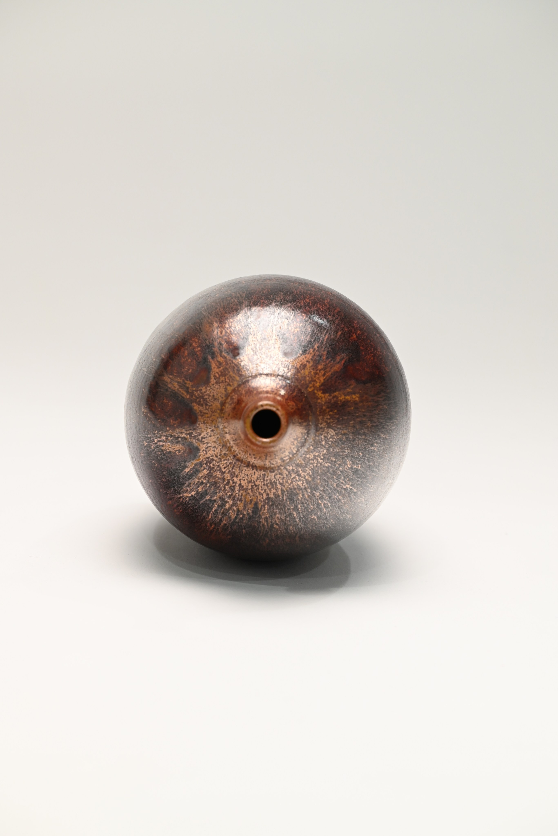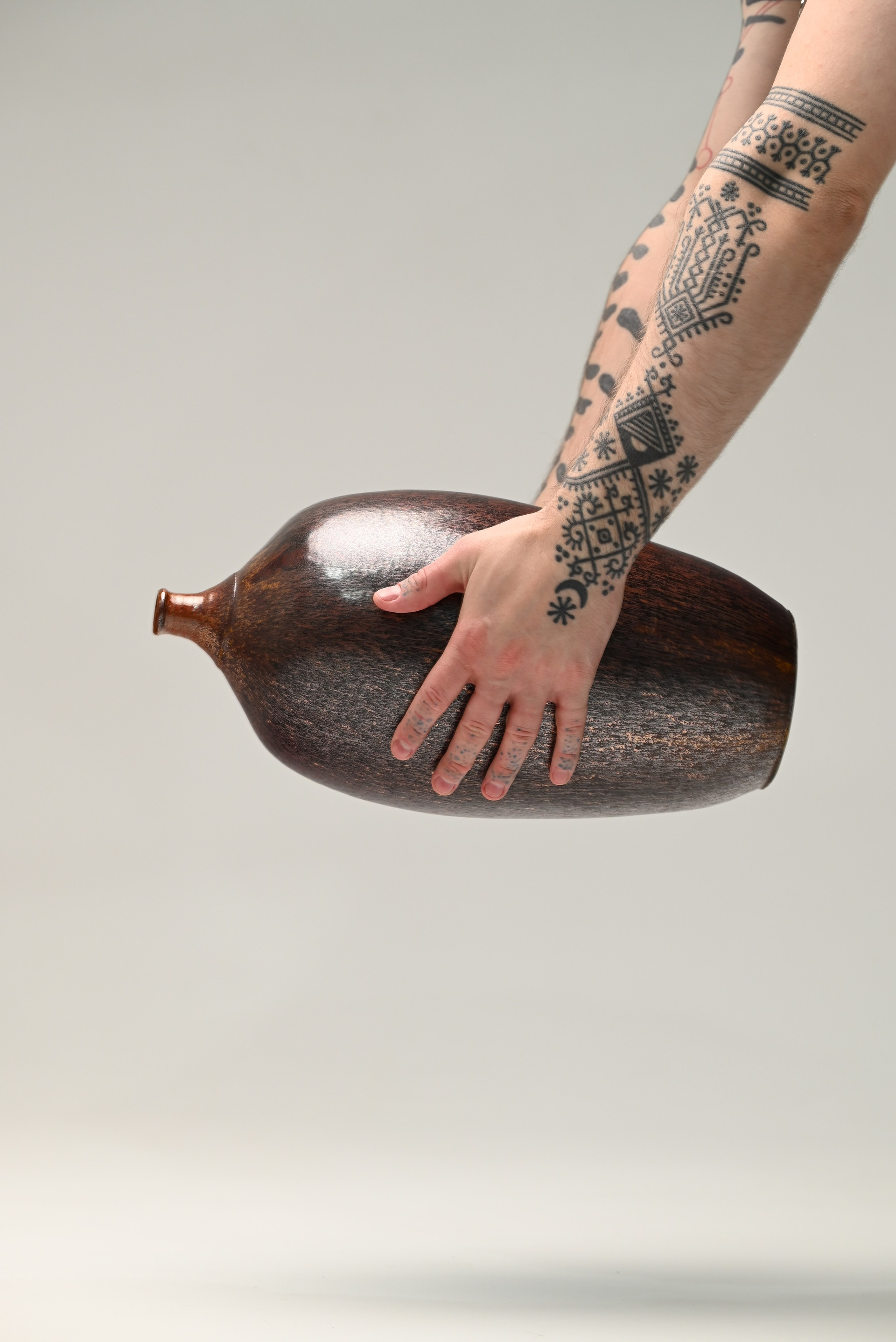 Каменная масса, глазурь.40х17 см, 2025.Форма напоминает вытянутое ядро кометы. Поверхность сосуда - глубокие переливы тёмно-коричневого и чёрного, прорезанные проблесками красноватого сияния, словно искры звёздной пыли. от лат. tenebris - «тьма»